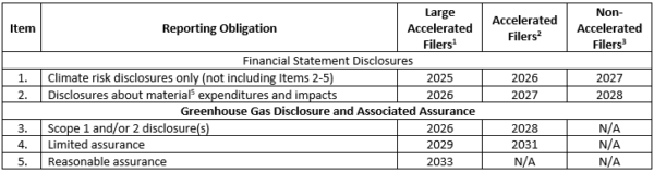 The “Enhancement and Standardization of Climate-Related Disclosures for Investors”[3] effective date is May 28, 2024[4]. The due dates for disclosure vary depending on the filing status of SEC registrants as shown in the table below. The SEC estimates that some 2,700 U.S. companies and hundreds of foreign companies filing with the SEC will be affected by the rules to be codified in 17 CFR §§ 210, 229, 230, 232, 239, and 249.