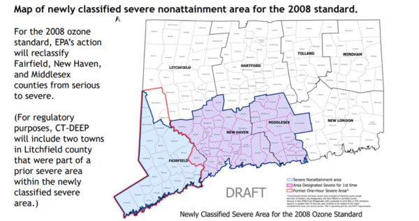 On November 7, 2022, 43 Connecticut towns were reclassified as severe non-attainment with respect to the 2008 ozone National Ambient Air Quality Standards (NAAQS). The reclassification affects sources located in Fairfield [1], New Haven, and Middlesex Counties and has the potential to trigger permitting (Title V and New Source Review) and require the installation of more stringent control technology.