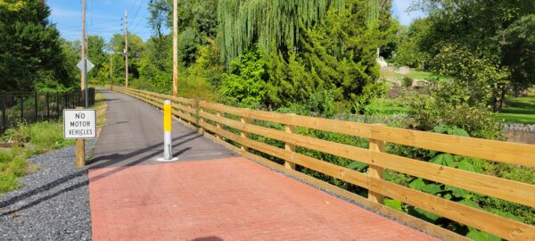 Throughout the length of this approximately 1 mile trail are roadway tie-ins, removable bollards, and a three-rail fence in order to provide users with a safe continuous pathway while also preventing unauthorized vehicle use along the trail. The trail crosses three city streets, meaning that roadway striping, signage, and trail signage were necessary to provide a safer crossing for trail users and motorists.