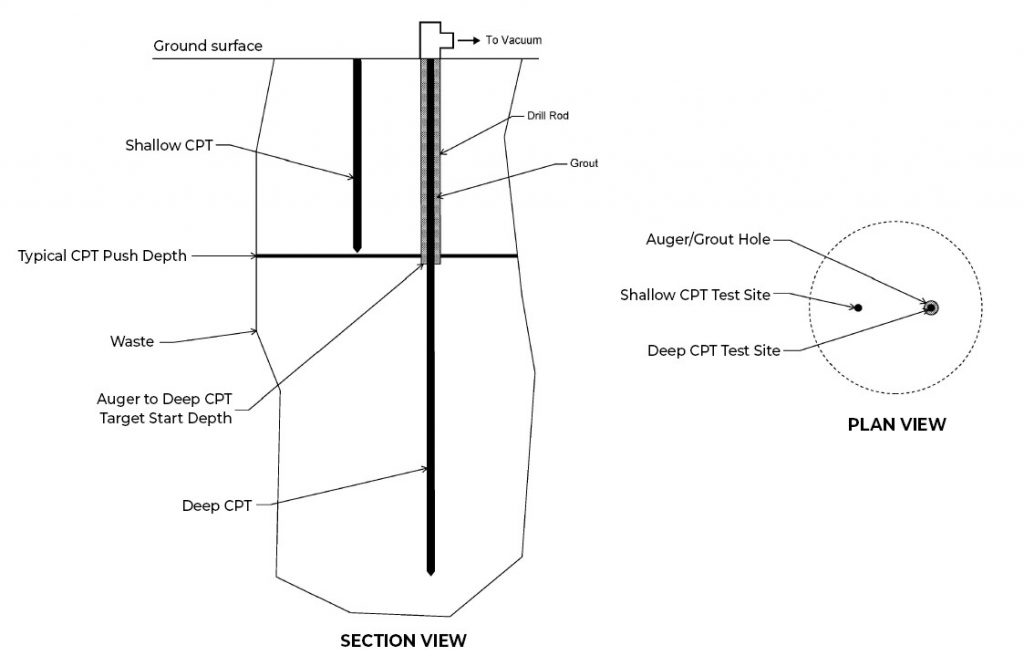 Cone Penetrometer Tests (CPTs) are performed to evaluate subsurface liquid conditions and provide detailed information on the strength of the waste materials. A shortcoming of this test is that it typically has a limiting depth of 75 feet. However, Tim developed a procedure to extend the depth of the test to 150 feet.