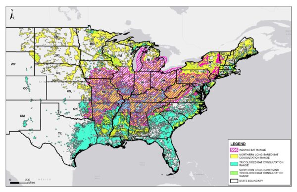 Note: For projects located within the Indiana bat range (as shown above), more rigorous species conservation measures will likely be required for that species than are required within the consultation ranges for NLEB and TCB. Also, this Guidance is subject to more or less stringent guidelines that a state USFWS field office or the state agency regulators may place on these species in their state. Finally, this Consultation Guidance does not apply to wind projects; however, wind guidance documents for NLEB and TCB were also published yesterday.