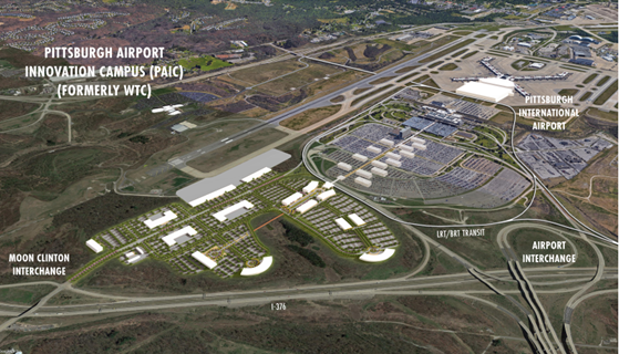 The consulting team, led jointly by CEC and MXD Development Strategists, conducted a comprehensive “Economic Master Planning” process that included market analytics, physical site analytics, broad conceptual alternatives, and financial feasibility analytics. Working with a multi-party steering committee formed for the project, the CEC/MXD Team identified an “Airport Innovation Campus” theme as a key driver of the path forward. Linked with a separate regional initiative to develop a Pittsburgh Innovation District based in the Pittsburgh downtown/university core, the newly branded Pittsburgh Airport Innovation Campus (PAIC) will provide airport-connected space for innovation-related uses that will not fit in urban Pittsburgh. The CEC/MXD team prepared an action strategy for implementation that commenced in the fall of 2018.